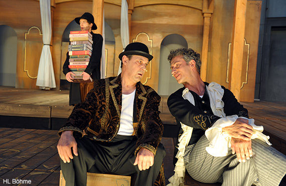 "...was die mit Lust und Witz und größter Spielfreude auf die schlichte, an ein Wandertheater erinnernde Bühne (Jan Steigert) bringen, ist herrliches Komödientheater...."